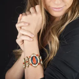 in oro 9kt, trasformabile in due bracciali, composta da una serie di maglie a volute concatenate impreziosite da fiori di corallo inciso e fili di microperle, con al centro un elemento ovale decorato in smalto e raffigurante una ballerina danzante su corallo intagliato, lungh. cm 17, gr. 135 complessivi