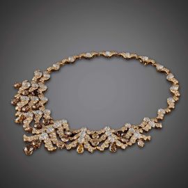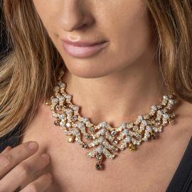 in oro giallo e bianco 18kt, impreziosita da diamanti bianchi, gialli e fumè taglio brillante e a goccia per ct 45 circa, firmata "Webb", punzone 18kt e 750, lungh. cm 37, gr. 104