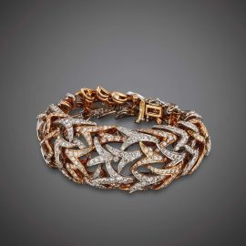 in oro giallo 18kt e platino, realizzato a forma di tralcio con elementi a foglia impreziositi da diamanti taglio brillante (uno mancante) per ct 10 circa, firmato "Webb", dim. cm 6,5x6,5 circa, circonferenza interna cm 15, gr. 82