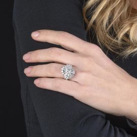 in oro bianco 18kt, impreziosito al centro da un diamante taglio brillante di ct 1 circa, circondato da diamanti taglio brillante e navette per ct 2.10 circa, mis. 12/52, gr. 8