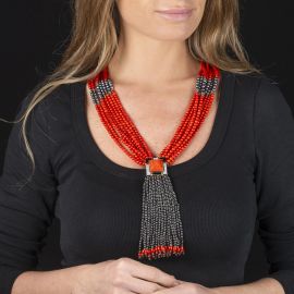 composta da otto fili di sfere e barilotti in corallo di mm 5 circa alternate a perle grigie di mm 5 circa, parte centrale a forma di nappa, con elemento rettangolare in oro giallo e bianco 14kt da cui pendono numerosi fili di perle grigie di mm 3 circa e barilotti in corallo di mm 5x5 circa, lungh. cm 80, gr. 301