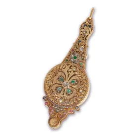 in oro 18kt e argento, lavorata a traforo e realizzata a forma di tralci fioriti, impreziosita da pietre di colore e sintetiche taglio rotondo e fantasia, e da diamanti taglio a rosa, meccanismo a per la fuoriuscita delle lenti, dim. cm 4x11,5, gr. 80