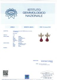 in oro giallo 18kt, impreziositi da diamanti taglio brillante e a goccia per ct 3 circa, da cui pendono due rubini taglio a goccia per ct 4.60 circa, chiusura a clip con perno, dim. cm 1,5x2, gr. 7 complessivi. Corredati di certificati IGN del 15/01/2025 attestante le caratteristiche.