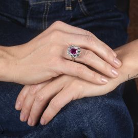 in oro bianco 18kt, impreziosito al centro da un rubino taglio cuscino di ct 2 circa, circondato da una fila di diamanti taglio brillante per ct 2.50 circa, punzone 750, mis. 15/55, gr. 7