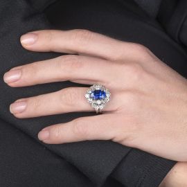 in oro bianco 18kt, impreziosito al centro da uno zaffiro taglio ovale di ct 4 circa, circondato da diamanti taglio brillante per ct 1.60 circa e diamanti taglio navette per ct 1 circa, punzoni 750 e del fabbricante, mis. 13/53, gr. 6