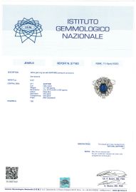 in oro bianco 18kt, impreziosito al centro da uno zaffiro taglio ovale di ct 1.60 circa, circondato da diamanti taglio tapes e brillante per ct 1.90 circa, punzone 750, mis. 16/56, gr. 6. Corredato di certificato IGN del 17/04/2025 attestante le caratteristiche.
