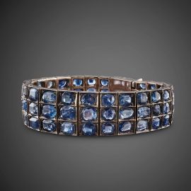 in oro 9kt e argento, impreziosito da tre file sovrapposte di zaffiri taglio ovale e rotondo per ct 40 circa, lungh. cm 18, gr. 67