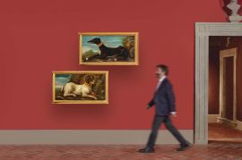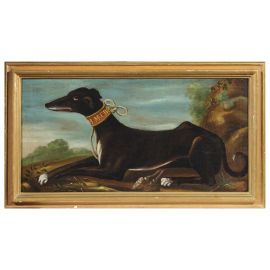 TWO CROUCHED DOGS IN A LANDSCAPE