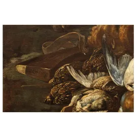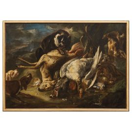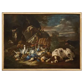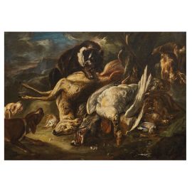 Game in a landscape signed: “B. D. Caro f.” to the left on the rifle