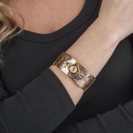 in oro 9kt, realizzato a fascia con parte centrale applicata decorata in smalto, diam. cm 6 circa, circonferenza interna cm 17,gr. 13