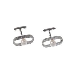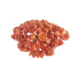 in corallo inciso e oro giallo 18kt, punzoni 750 e del fabbricante, dim. cm 6x4,5, gr. 30; accompagnata da un paio di gemelli in oro 14kt, impreziositi da perle di mm 7 circa, dim. cm 2x1x2 circa, gr. 10 complessivi