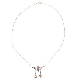 in oro e argento, parte centrale con elemento pendente impreziosito da rose di diamante, lungh. cm 57, gr. 8