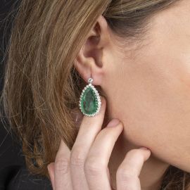 in oro bianco 18kt, impreziositi da due smeraldi taglio a goccia per ct 10 circa, circondati da diamanti taglio brillante per ct 2.40 circa, chiusura a farfallina, punzoni 750 e del fabbricante, dim. cm 1,5x3 circa, gr. 11 complessivi