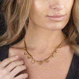 in oro giallo 18kt, composta da una serie di maglie rettangolari da cui pendono piccole sfere alternate ad elementi a forma di fiori stilizzati, punzoni 750 e del fabbricante, lungh. cm 44, gr. 18