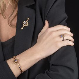 in oro 9kt, composta da un bracciale rigido di diam. interno cm 5,5, una spilla di cm 5x2 circa, e un anello contrarié di mis. 13/53, impreziosita da microperle e zaffiri taglio rotondo (due mancanti) per ct 0.70 circa, gr. 14 complessivi