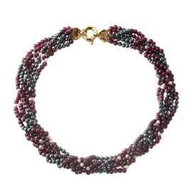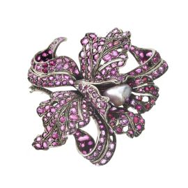 realizzata a sei fili di sfere in ematite e pietre semipreziose di mm 4 circa, alternate a perle di mm 3 circa, fermatura in oro giallo 18kt, lungh. cm 41, gr. 119; accompagnata da una spilla in argento, impreziosita da una perla barocca, rubini naturali e sintetici taglio rotondo (alcuni mancanti), dim. cm 6x6 circa, gr. 34