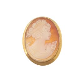 in oro giallo 18kt, punzone 750, lungh. cm 40, accompagnata da una spilla in oro giallo 18kt, di forma ovale, con al centro un cammeo su conchiglia, punzoni 750 e del fabbricante, dim. cm 2,5x3,5, gr. 23 complessivi