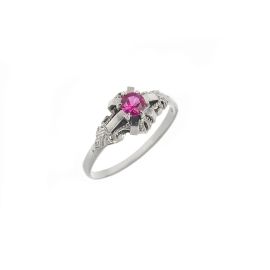 anello in oro bianco 18kt, con pietra sintetica rossa, punzone del fascio, mis. 19/59, accompagnato da un paio di orecchini in oro giallo 18kt, impreziositi da due ametiste sfaccettate e sormontate da due perle di mm 4 circa, punzoni 750 e del fabbricante, dim. cm 1x2, gr. 4 complessivi