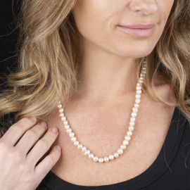 di cui una realizzata ad un filo di perle di mm 5 circa, fermatura in oro bianco 18kt con zaffiro taglio rotondo (difetti), punzone 750, lungh. cm 46, accompagnata da una seconda collana ad un filo di perle di mm 7 circa, fermatura in oro 14kt, lungh. cm 52, gr. 59 complessivi