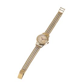cassa in oro giallo 18kt, fondello a pressione, quadrante champagne, indici applicati, movimento a carica manuale, bracciale in oro giallo 18kt a maglia tessita con chiusura a scomparsa non marcato, lungh. cm 16 circa, vetro plastica, gr. 26. Diam. mm 23. Orologio non funzionante.
