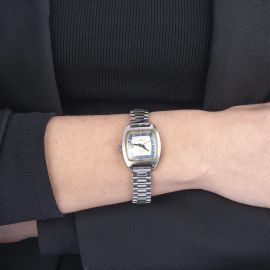 cassa tonneau in acciaio, fondello serrato con viti, corona marcata, quadrante argentè e blu, grafica nera, indici applicati, datario a ore tre, movimento a carica automatica, bracciale a maglie in acciaio con chiusura a scatoletta non originali, lungh. interna cm 20, vetro plastica. Dim. mm 25x33