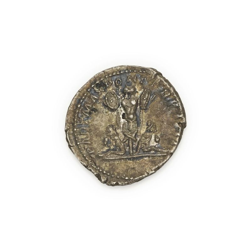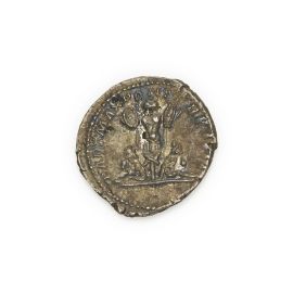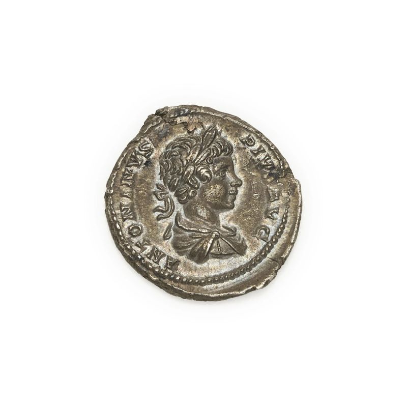D: busto infantile di Caracalla a destra – R: trofeo militare; alla base due prigionieri – gr. 3,43 – Ritratto di stile raffinato e apprezzabile patina, SPL – Da un appunto del collezionista acquistato da Raviola nel novembre 1969 (RIC n. 54) (Coh. n. 175) (Ag)