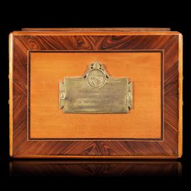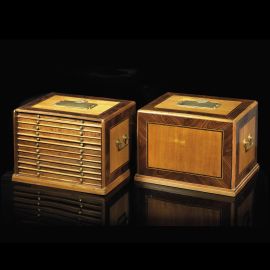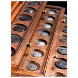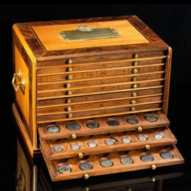 Monete in bronzo e argento in appositi contenitori originali in legno e ottone