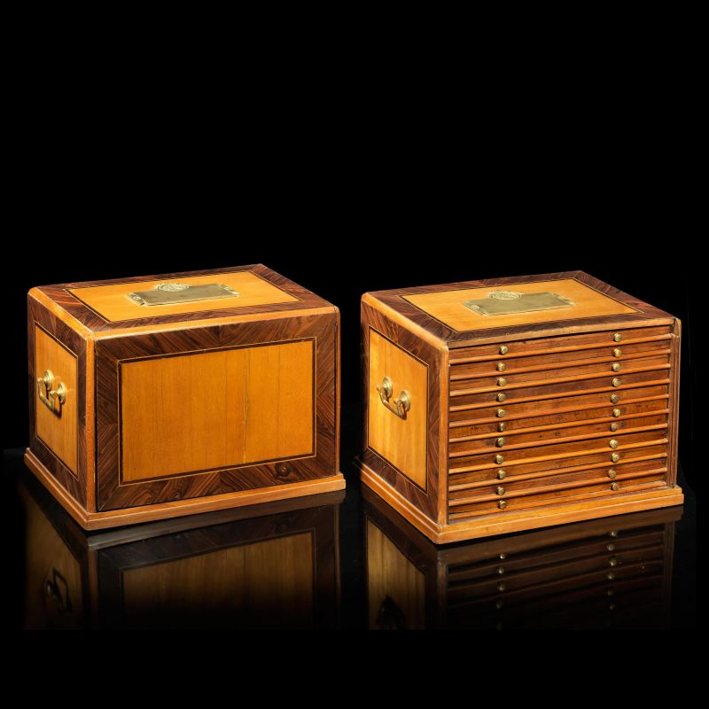 I quattro splendidi mobili contenitori appositamente realizzati (e le eleganti placche superiori in ottone con stemma Chiaramonti di cui due con cartiglio inciso) sono la testimonianza tangibile di una volontà di far vedere e condividere, un'esibizione culturale e di potere economico, caratterizzata da uno studio attento e metodico. La collezione qui si fa letteralmente portatrice di conoscenza nella storia e nel tempo.