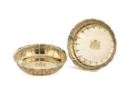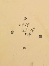 in vermeil, di forma circolare, alta tesa scanalata e decorata da motivi geometrici, al centro stemma nobiliare con cartiglio iscritto IN SOLO DEO SALUS, diam.cm 25, alt. cm 6, complessivi g 2890