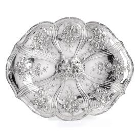 di forma ovale in argento con decoro a sbalzo a fiori e putti, cm 71x55, complessivi g 3560