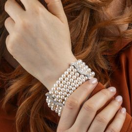 in oro bianco 18kt, realizzato ad ampia fascia con cinque fili di perle di mm 5 circa, distanziali impreziositi da diamanti taglio brillante per ct 0.60 circa, firmato "Torrini", punzoni 750 e del fabbricante, lungh. cm 18,5, gr. 61