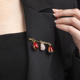 BARRETTE BROOCH IN 14KT GOLD WITH THREE PENDANT EGGS