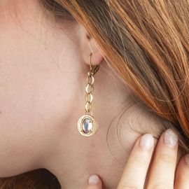 in oro giallo 18kt, realizzati a catena, con ciondoli circolari recanti al centro due doppiette composte su un lato da ametiste con retro in cristallo di rocca, firmati "Chimento", punzoni 750 e del fabbricante, lungh. cm 5, gr. 7 complessivi