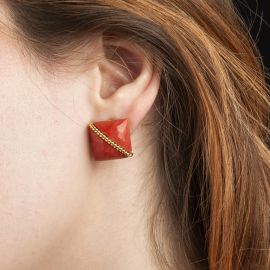 in oro giallo 18kt, di forma quandrangolare, composti da elementi in corallo divisi al centro da cordicelle in oro, chiusura a clip con perno, punzoni 750 e del fabbricante, dim. cm 1,5x1,5, gr. 13 complessivi