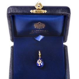 in oro giallo 18kt, decorato in smalto blu e impreziosito da diamanti taglio brillante, firmato "Fabergé", punzone 750, numerato 150/1000, dim. cm 1,3 circa, gr. 6. Corredato di scatola e controscatola.