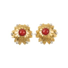in oro giallo satinato e bianco 18kt, realizzati a forma di fiore, impreziositi da due coralli taglio cabochon e diamanti taglio brillante per ct 0.30 circa, chiusura a clip con perno, accompagnati da una spilla in oro giallo 18kt, con corallo inciso a forma di putto, punzone 750, dim. cm 4x1,5 circa, gr. 21 complessivi