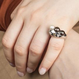 in oro bianco 18kt, impreziosito da perle di cui una bianca e due grigie di mm 6 circa, con diamanti taglio fantasia per ct 0.60 circa, punzone 750, mis. 5/45, gr. 13