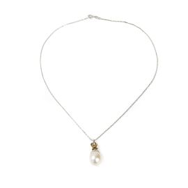 in oro bianco 18kt, pendente in oro 14kt, con perla di mm 13 circa e diamanti taglio brillante per ct 0.10 circa, punzoni 750 e del fabbricante, lungh. cm 42, gr. 9
