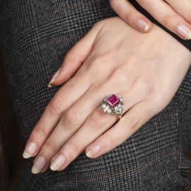 in oro bianco 18kt, impreziosito da uno zaffiro rosa taglio rettangolare (difetti) di ct 1.40 circa, circondato da diamanti taglio brillante e baguette per ct 1.50 circa, mis. 15/55, gr. 7