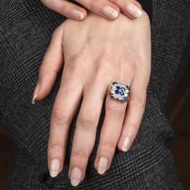 in oro giallo 18kt e platino, impreziosito da zaffiri taglio rotondo per ct 1.30 circa e diamanti taglio vecchio per ct 1.20 circa, punzone 750, mis. 14/54, gr. 5