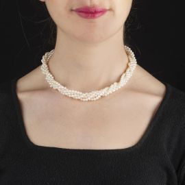 realizzata a cinque fili di perle di mm 3 circa, fermatura in oro giallo e bianco 18kt impreziosita da diamanti taglio huit huit per ct 0.35 circa, lungh. cm 40, gr. 49