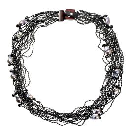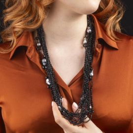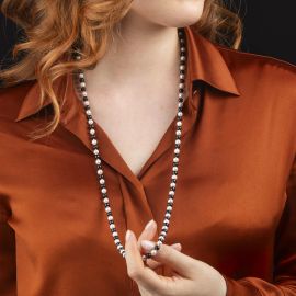 di cui una composta da quattordici fili di spinelli neri e perle grigie, lungh. cm 76; una seconda in corallo, fermatura in oro giallo 18kt, punzone 750, lungh. cm 58; accompagnate da una terza collana ad un filo di perle e boules nere di mm 5 circa, fermatura in oro bianco 18kt, punzoni 750 e del fabbricante, lungh. cm 88, gr. 219 complessivi