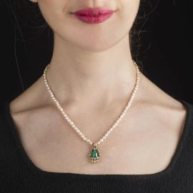 in oro giallo 18kt, di cui una realizzata ad un filo di perle di fiume, con pendente impreziosito da uno smeraldo taglio cabochon di ct 3.80 circa e diamanti taglio brillante per ct 0.15 circa, lungh. cm 34; accompagnata da una seconda collana ad un filo di perle di mm 3 circa, con elemento pendente impreziosito da un rubini taglio a goccia di ct 0.10 circa e diamanti taglio huit huit, punzoni 750 e del fabbricante, lungh. cm 41, gr. 23 complessivi