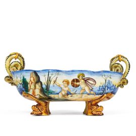 in maiolica dipinta in policromia, corpo di forma ovaleggiante con due prese serpentiformi, così come le quattro zampe. Il decoro delle pareti esterne si ispira chiaramente a modelli rinascimentali urbinati, come confermato dalla nomenclatura usata in manifattura per questo modello: “Giardiniera Urbino, detta raffaelleschi”. Marca della manifattura e numero 29 in blu sul fondo; cm 20x40x27,4
