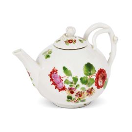 in porcellana dipinta in policroma, corpo globulare con ansa a forma di doppio rametto e versatoio portato alto appena incurvato, coperchio a cupola sormontato da un bocciolo chiuso. Il decoro floreale europeo è centrato da una rosa gialla sfogliata accompagnata da fiori naturalistici dipinti con abbondanza di pigmento. La teiera, priva di marca, trova riscontro nelle opere della manifattura veneziana, come ad esempio in alcune pubblicate in occasione dell’ultima mostra monografica su Cozzi; alt. cm 8,6, diam. piede cm 4,5
