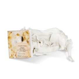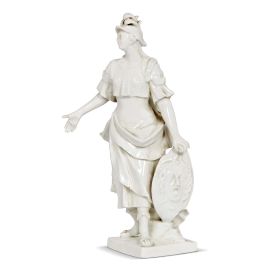 in porcellana bianca raffigurante Minerva, caratterizzata da una grande qualità nel modellato. La dea ha il capo cinto da un elmo, indossa una tunica con maniche svolazzanti trattenuta sul busto da una lorica corta, i fianchi cinti dalla tunica a larghe pieghe, la mano sinistra appoggiata allo scudo ornato dal capo di Medusa. Le figure da dessert per la tavola, create dalla manifattura di Meissen negli anni quaranta, si diffusero come gusto anche negli altri centri, ma quelle della manifattura Imperiale di Vienna sono piuttosto rare. Sotto la base marca in blu e etichetta di provenienza S. Giusti / U. Podestà – Milano; alt. cm 21,6