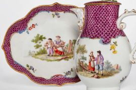 in porcellana dipinta in policromia, composto da due tazzine con piattino, una caffettiera e un piatto da dolce. Le due tazze a campana hanno un piccolo manico a sezione quadrangolare con andamento a S e piattini rotondi, la caffettiera ha manico a J e becco a mensola decorato a rilievo con coperchio piano e pomolo a bocciolo, il piatto ha tesa appena sollevata e orlo mistilineo. Tutti gli esemplari mostramo lungo i bordi un decoro a squame rosso porpora delimitati da rocailles alle quali sono appesi ramoscelli fioriti e fogliati, mentre al centro il motivo principale vede scene di personaggi popolari in paesaggi. Marca della manifattura in blu sul fondo; vassoietto cm 13,5x17,5, caffettiera alt. cm 15, tazzina alt. cm 6,6, piattino diam. cm 13,4