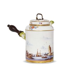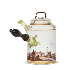 in porcellana dipinta in policromia, corpo cilindrico con coperchio piano che si innesta sul collo dotato di sfiatatoio e piccolo manico, beccuccio e presa, disposti in posizione non simmetrica, modellati a finto ramo di legno. La decorazione policroma vede una ricca scena portuale con mercanti, facchini e merci sulle banchine con edifici turriti sullo sfondo, scene portuali che secondo gli studiosi fanno riferimento al commercio d'oltremare che portava in Europa merci come il cioccolato. Questa forma, basata su un modello d'argento, fu realizzata nella fabbrica di Meissen a metà del XVIII secolo e gli esemplari sopravvissuti sono databili dal 1735 al 1745. Presa fornita di terminale in legno tornito. Sul fondo marca della manifattura in blu, sigla Z4 in manganese ed etichetta di provenienza S. Giusti / U. Podestà sul fondo; alt. cm 16,8, diam. bocca cm 6,7, diam. piede cm 11