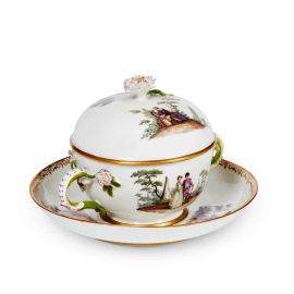 in porcella dipinta in policromia e oro. La tazza di forma emisferica è dotata di due anse ad anello abbellite da piccoli fioretti a rilievo, e il coperchio a calotta è sormontato da una presa a forma di rosellina, mentre il piatto circolare con tesa appena rilevata e l’orlo ornato da motivo in oro. L’ornato, disposto simmetricamente, mostra scene di giardini con personaggi nel gusto di “Wateau”. Sul fondo marca della manifattura in blu; tazza diam. cm 10,5, piatto diam. cm 17,5
