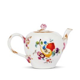 in porcellana dipinta in policromia e oro, corpo globulare rastremato verso il piede piano, beccuccio tenuto alto a forma di drago e ansa a J sagomata, coperchio piano con presa a forma di bocciolo. Il decoro a policromia mostra un insieme variopinto di piccoli frutti e fioretti, mentre l’ansa e il beccuccio sono decorati di porpora. Marca in blu sul fondo; alt. cm 8, cm 4,2